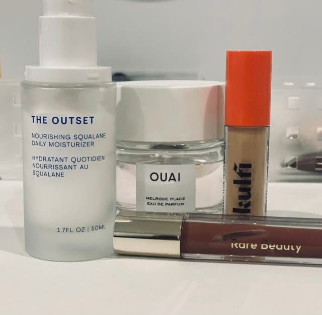 Glossier lip balm for everyday, plus Kjaer Weis eye balm. But going out makeup is Kulfi concealer under my eyes and anywhere needed, black mascara and Rare Beauty by Selena Gomez lip gloss. Sometimes I’ll add Glossier blush and eyeliner for extra special occasions. A couple spritzes of Ouai Melrose Place perfume and that’s it.